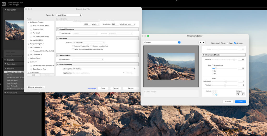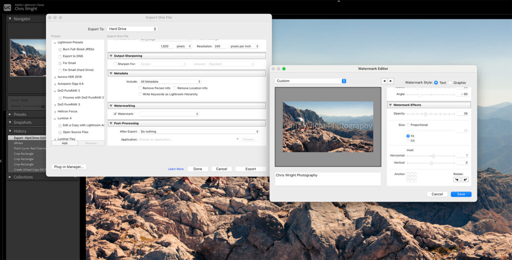 To create a watermark, the process is very similar in both PhotoLab and Lightroom. The difference is mainly that in PhotoLab you can preview the watermark as part of the image in the main viewing area. In Lightroom you can see it in the Watermark editor as above.