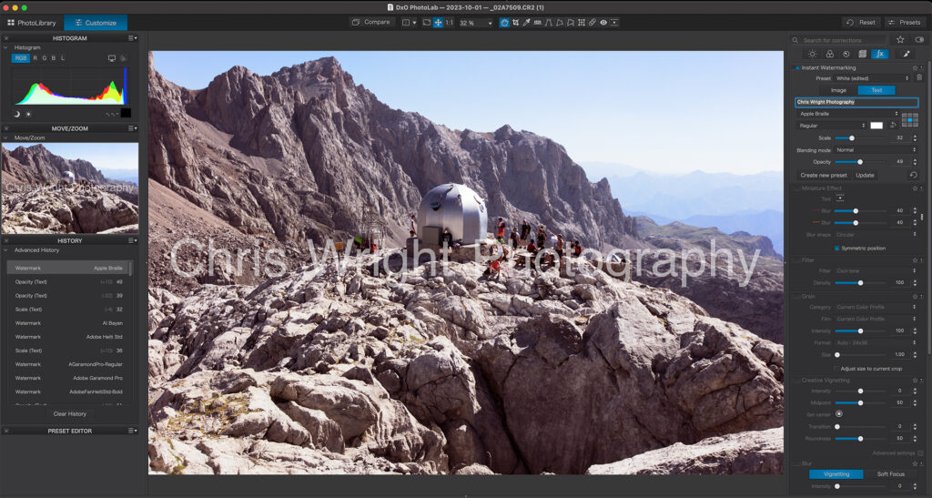 The import process in PhotoLab is in my opinion slightly better because you can see the watermark in large scale and switch it on or off depending what you’re exporting for.